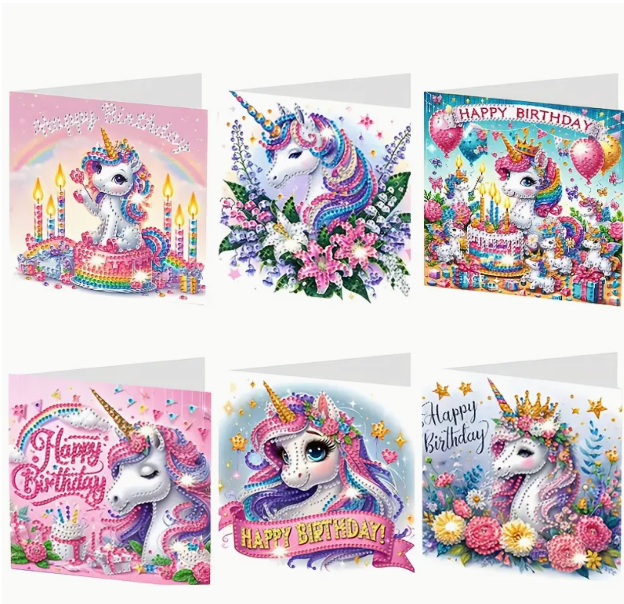 Gør dine fødselsdagshilsner ekstra personlige med dette sæt af 6 forskellige diamond paint-kort med flotte og farverige enhjørninger.