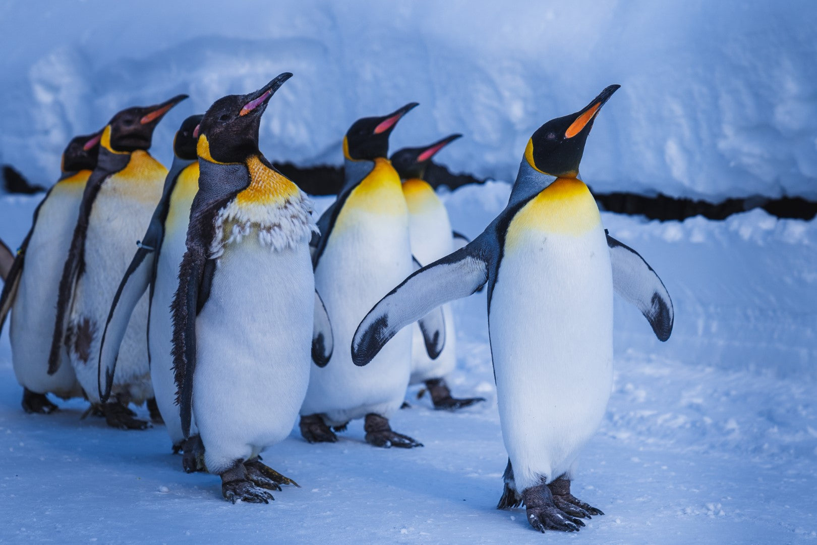 De smukke kontraster mellem deres sorte og hvide fjerdragter, de gyldne brystfarver og den blålige isbaggrund skaber et levende og stemningsfuldt vintermotiv.