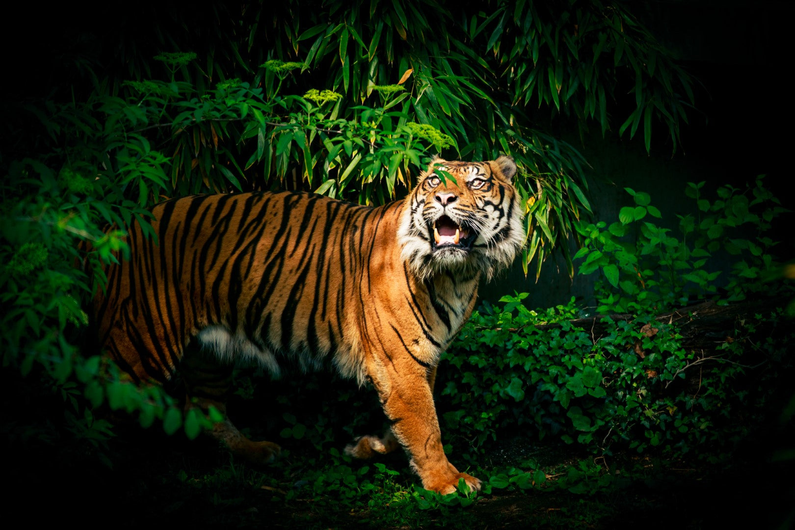 Sollyset bryder gennem bladene og rammer dens stribede pels, så både styrke og skønhed fremhæves på smukkeste vis.