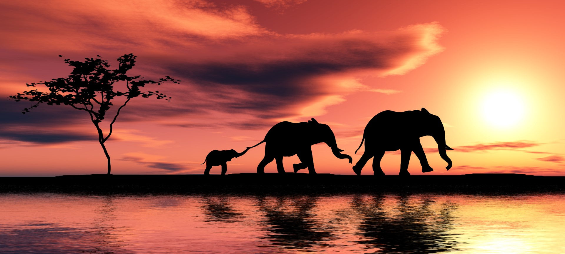 Diamond paint af 3 elefanter på række. Elefanterne er sorte mod solnedgangens røde nuancer.