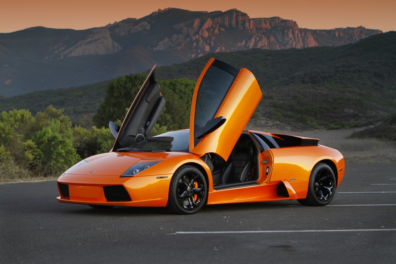 Dette iøjnefaldende diamond art-motiv viser en skinnende orange sportsvogn med ikoniske saksedøre, der står åben mod en baggrund af bjerge og aftenhimmel.
