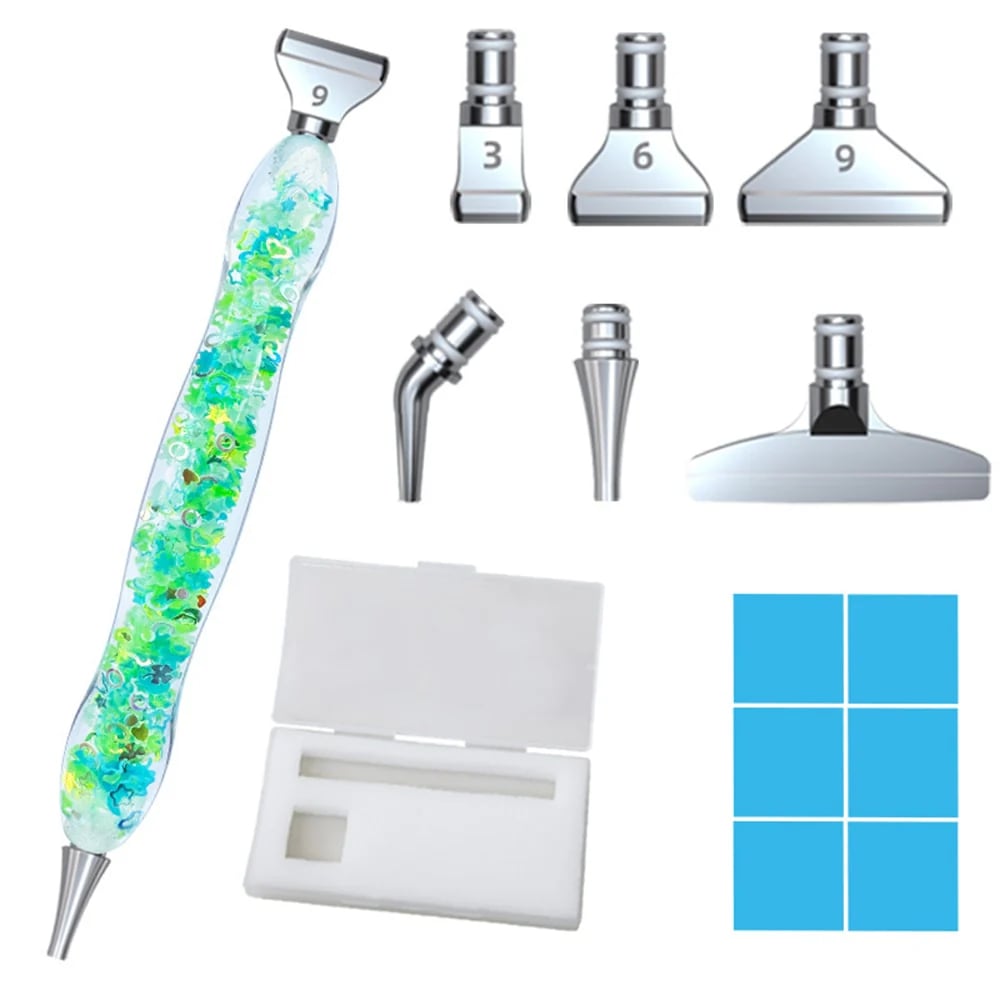 The pens come with interchangeable tips, so you can put multiple diamonds on at once. The tips are for 1, 3, 6 and 9 stones, plus a flat tip for straightening the stones and a curved tip.