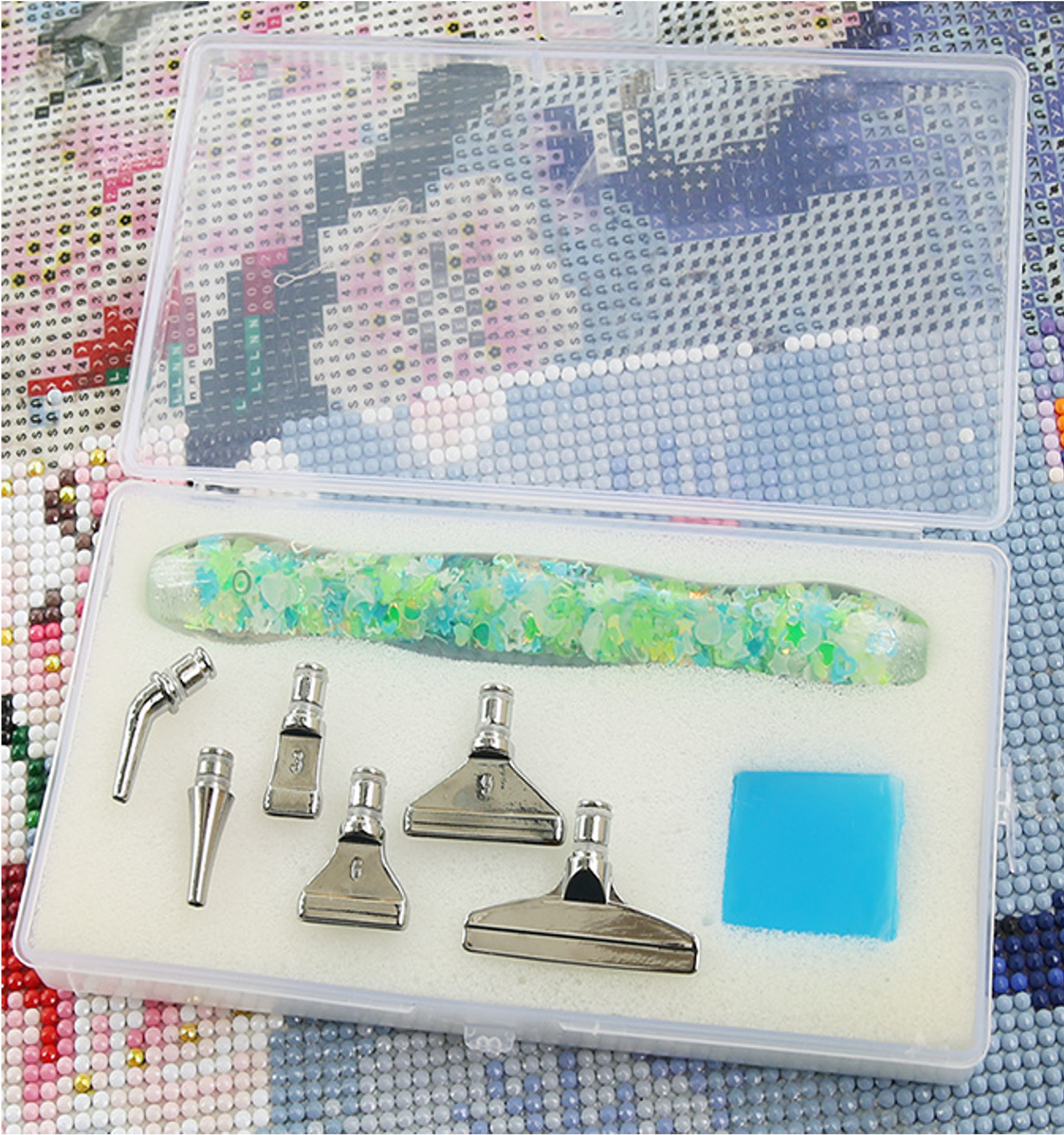 Diamond paint pen i æske med voks og forskellige metaltipper.