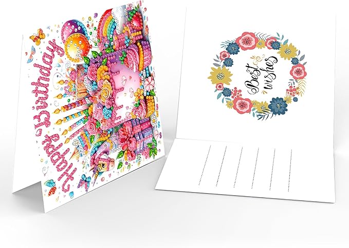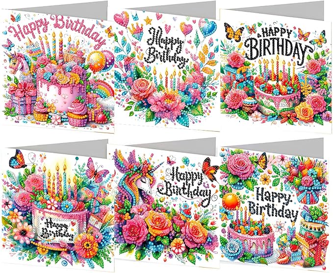 Gør dine fødselsdagshilsner ekstra festlige med dette sæt af 6 forskellige diamond paint-kort med flotte og farverige motiver.