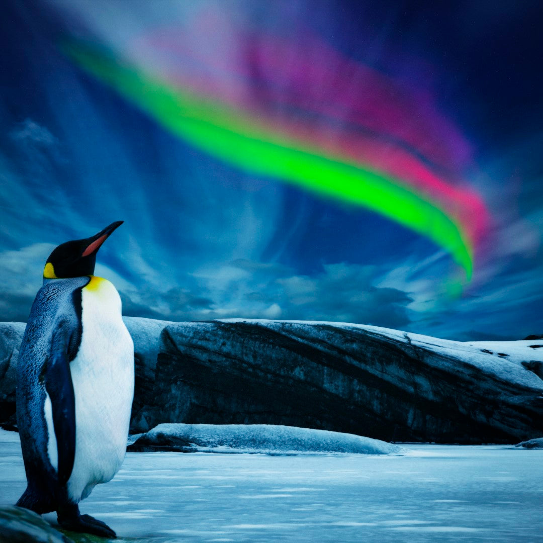 Dette smukke diamond paint-motiv viser en majestætisk pingvin, der står på isen og kigger op mod det farverige nordlys, som danser hen over den mørkeblå himmel.